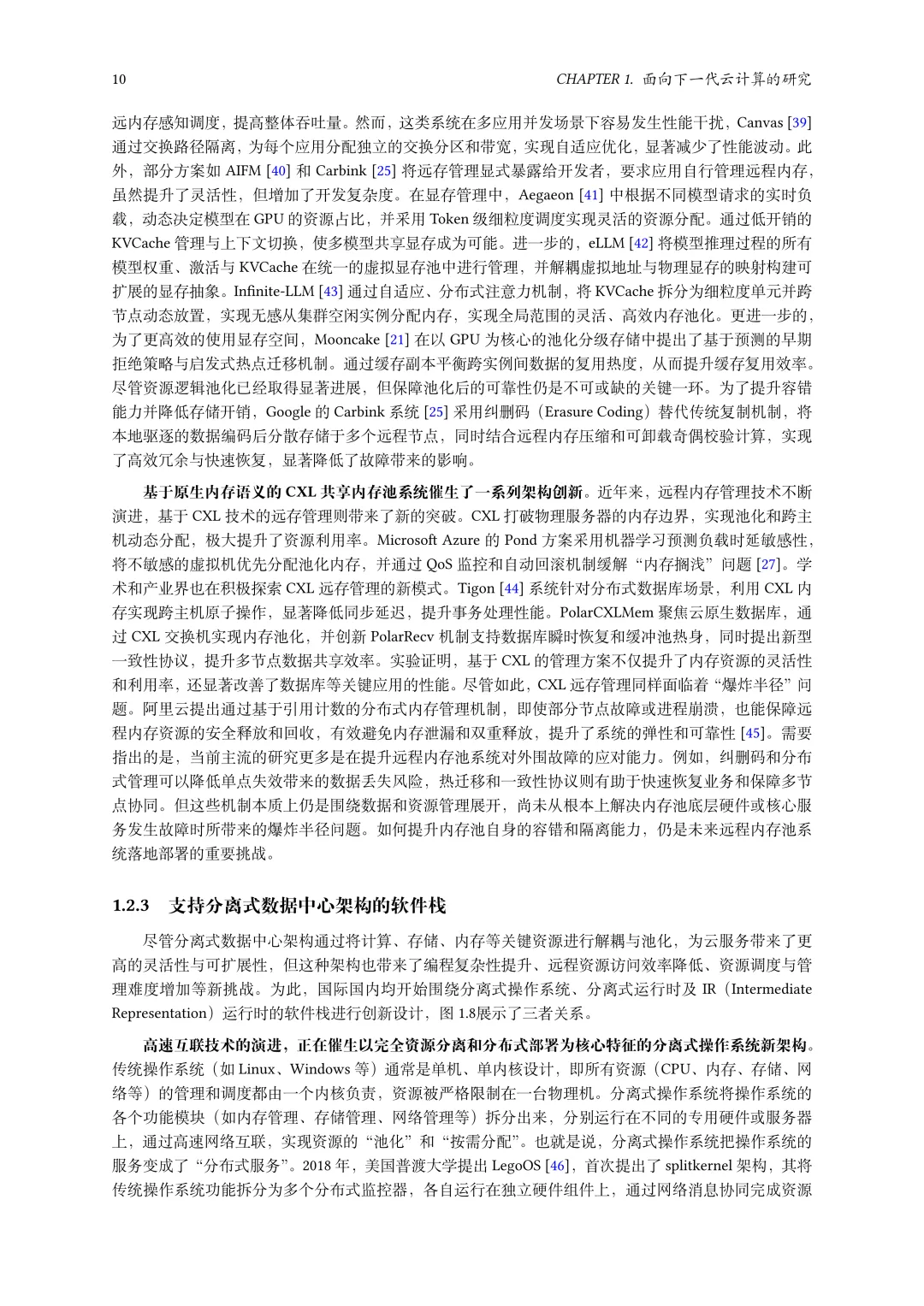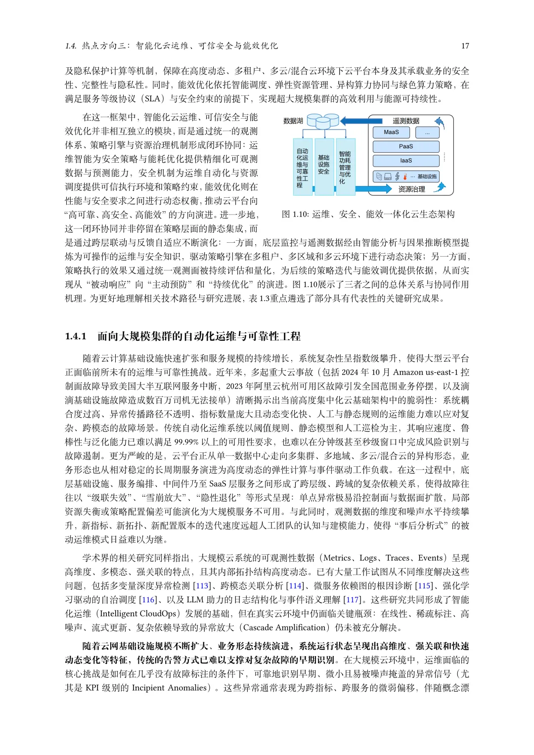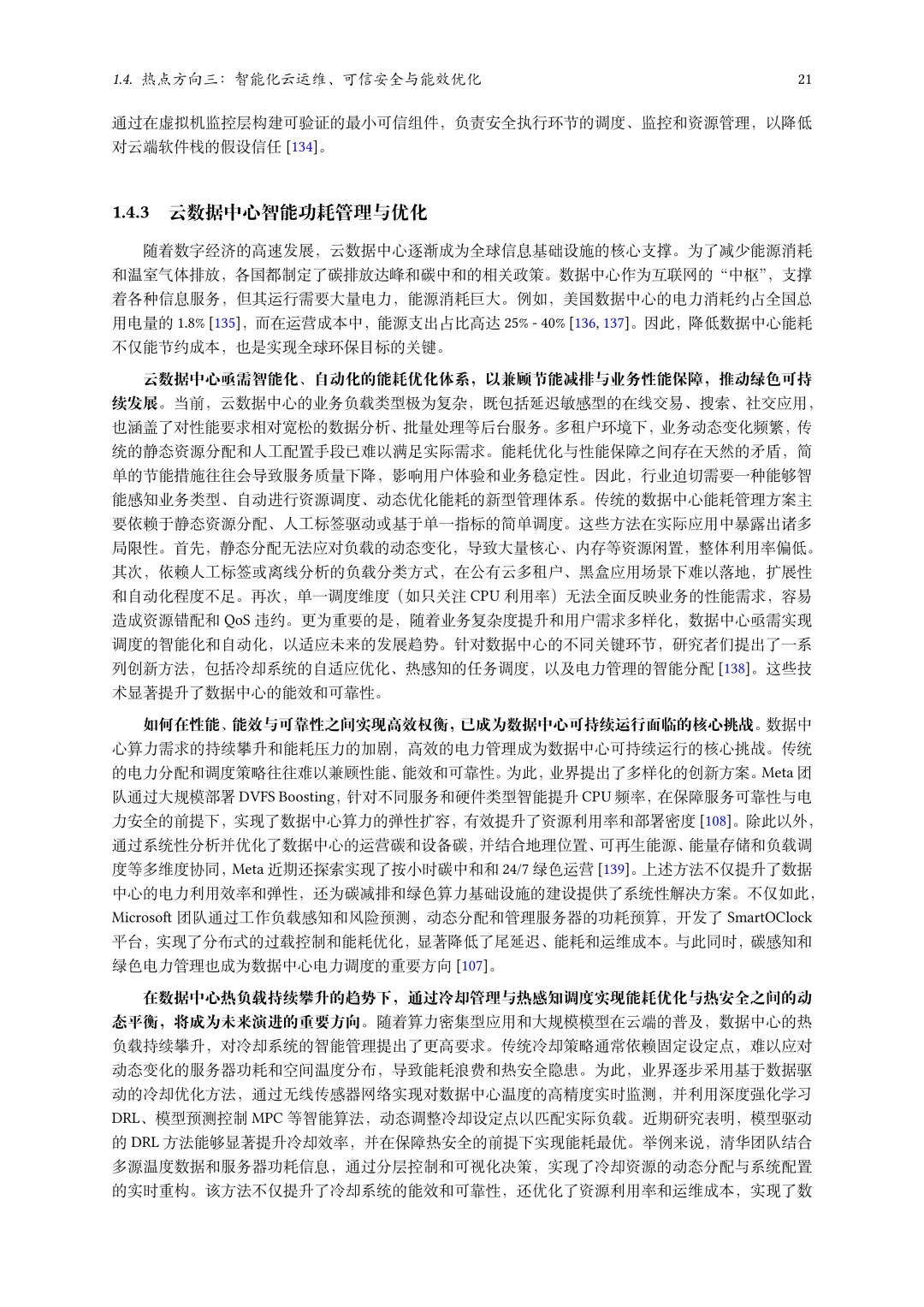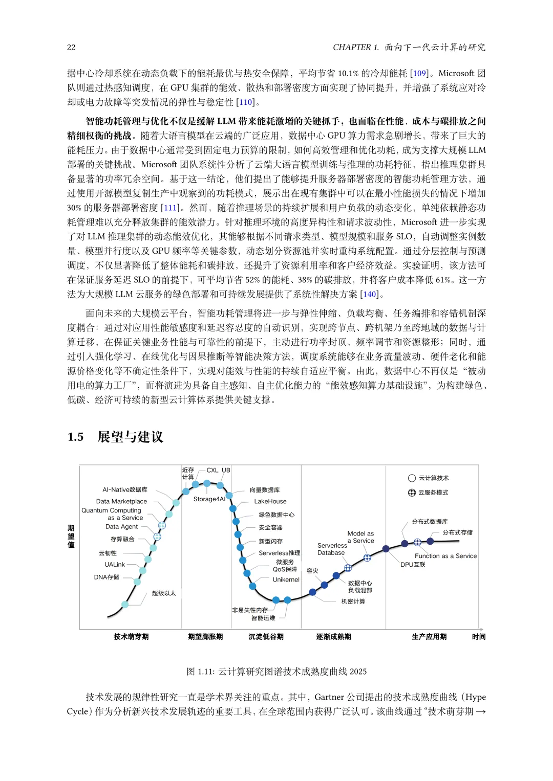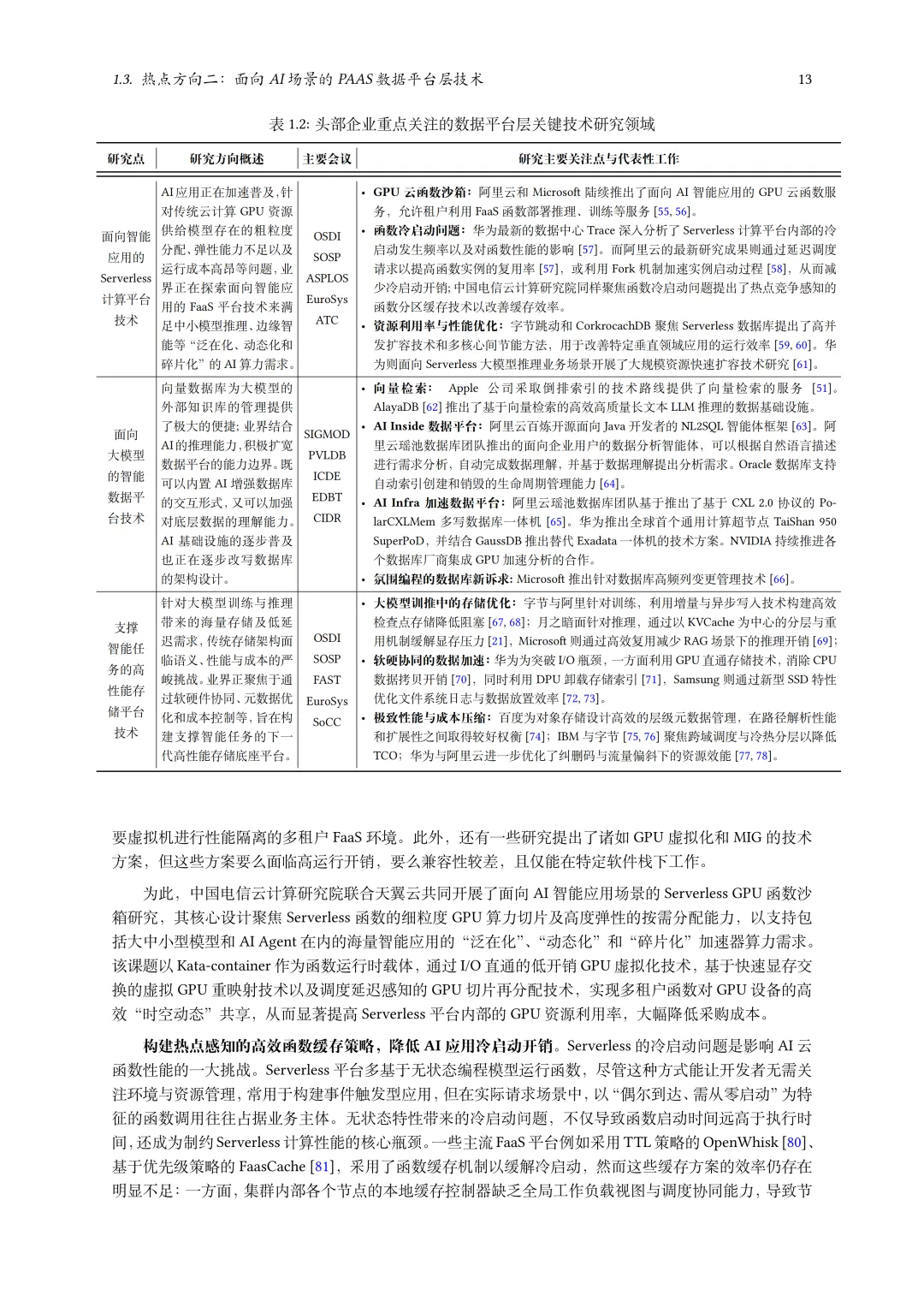第一章,面向下一代云计算的研究,首先分析了 2024 年国际国内的市场数据,解读了 IaaS、PaaS、SaaS 的占比及变化趋势,然后讨论了云计算开源和标准方面的进展,之后对行业软硬件技术热点做追踪,并利用近三年高水平论文统计梳理了技术热点,涉及 14 个 CCF 收录的顶级学术会议的 2800 余篇论文。统计结果显示,企业参与论文依然占据 1/3,新的变化是更多企业新面孔开始出现,例如中国电信等传统运营商、智谱等创业期企业。下一代云计算讨论了三个热点方向,分别是:(1)分离式数据中心架构和关键技术(2)面向 AI 场景的 PaaS 数据平台层技术(3)智能化云运维、可信安全与能效优化。