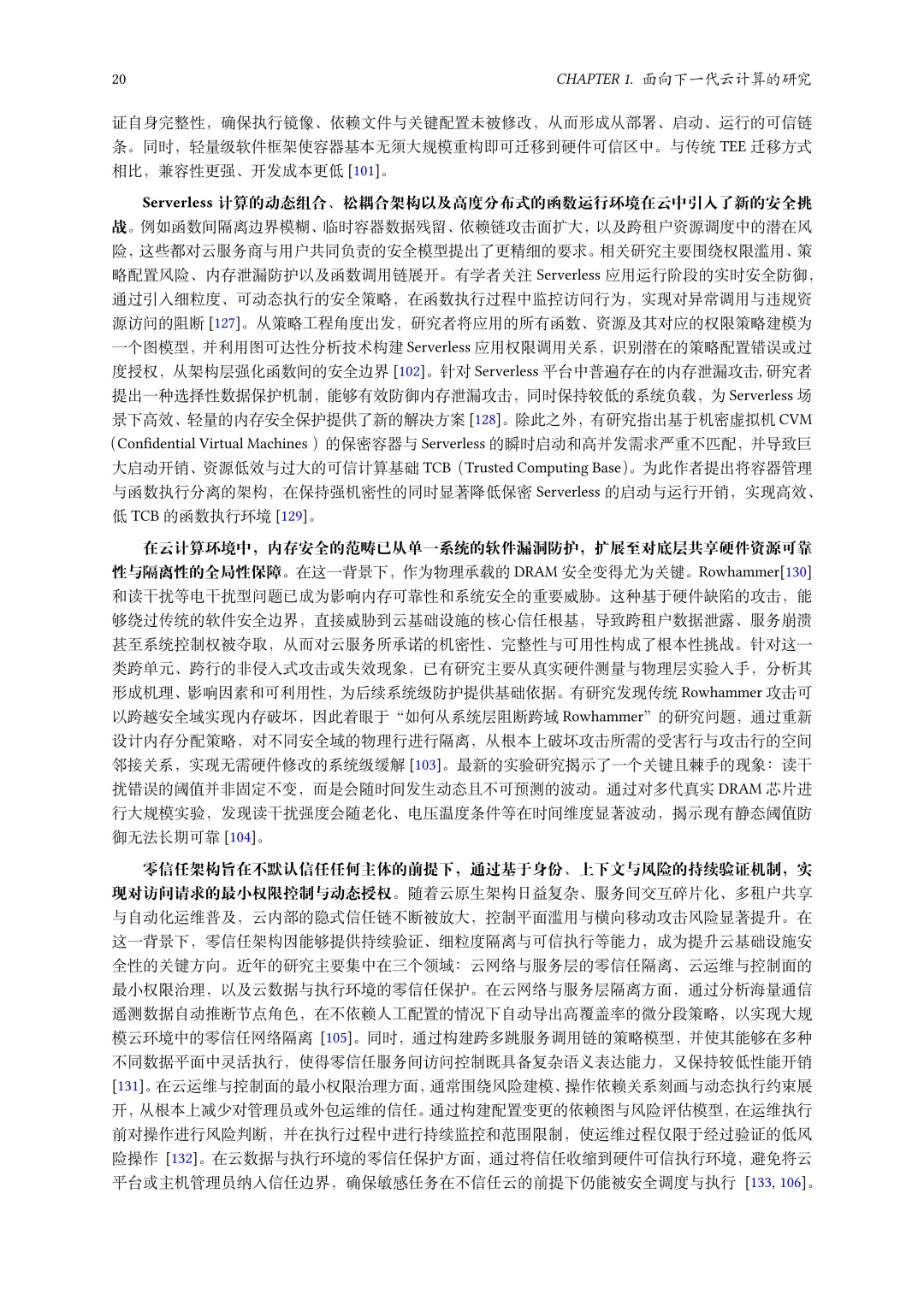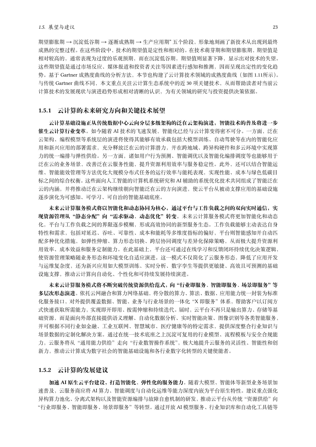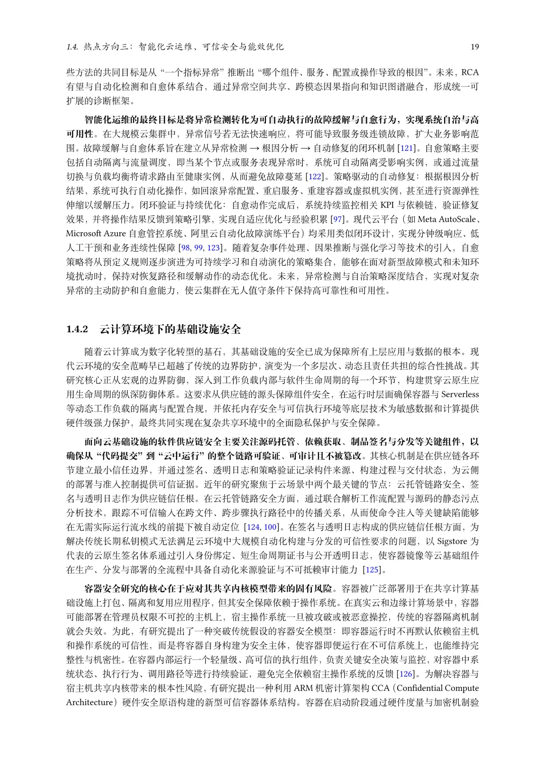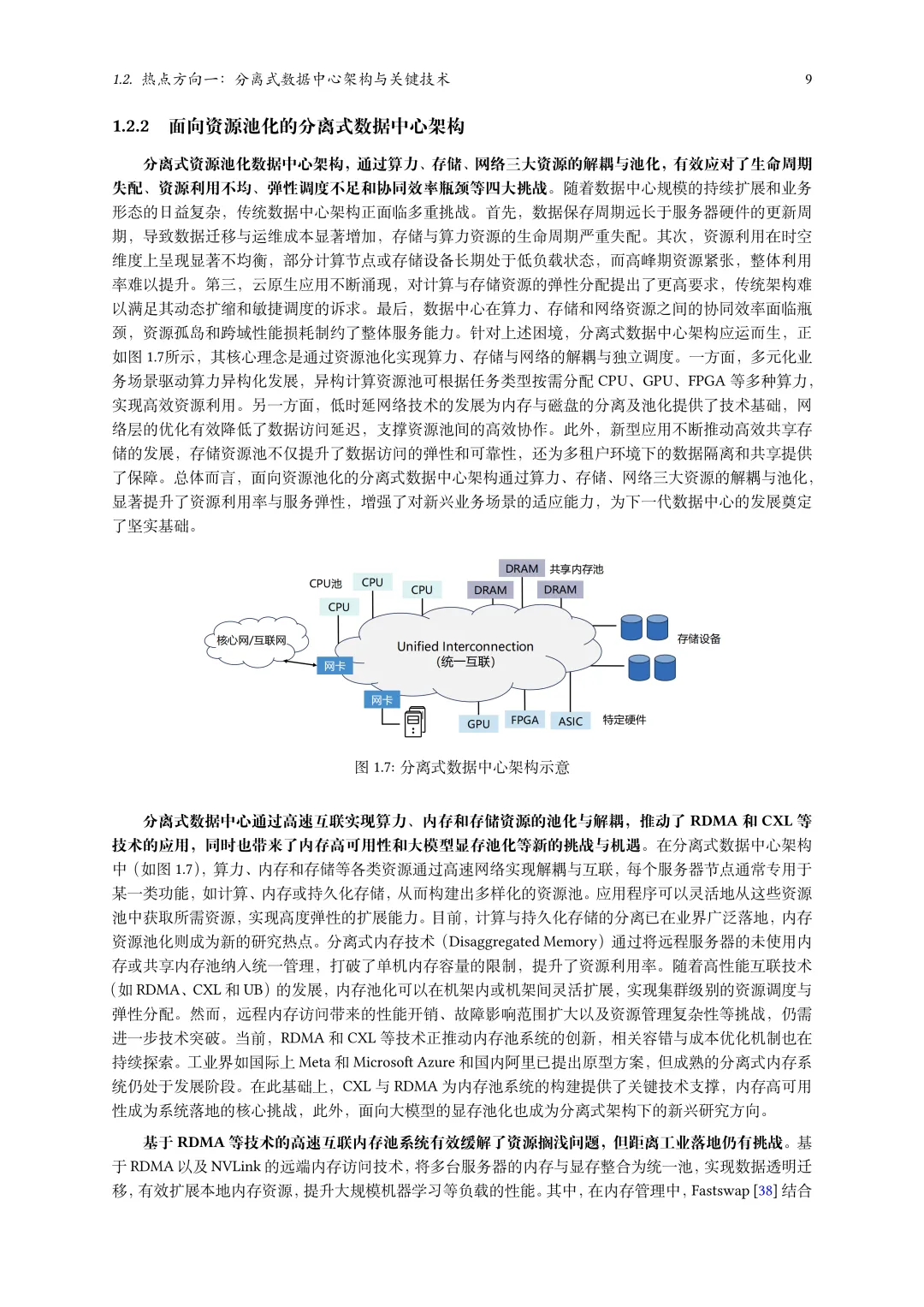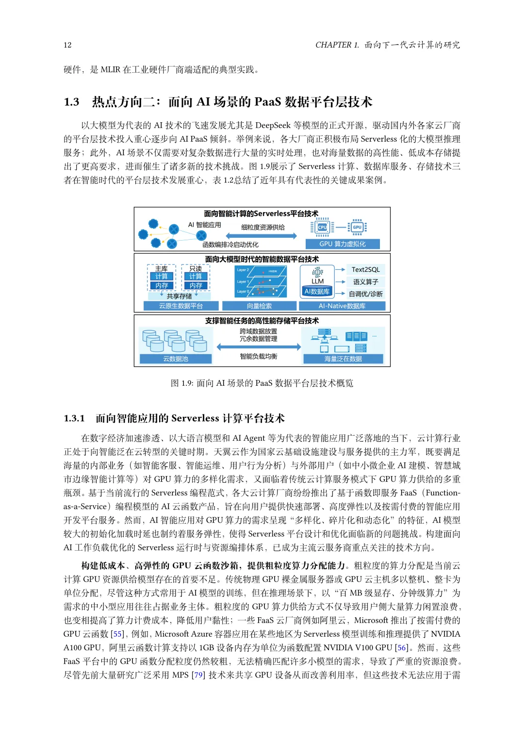 第一章,面向下一代云计算的研究,首先分析了 2024 年国际国内的市场数据,解读了 IaaS、PaaS、SaaS 的占比及变化趋势,然后讨论了云计算开源和标准方面的进展,之后对行业软硬件技术热点做追踪,并利用近三年高水平论文统计梳理了技术热点,涉及 14 个 CCF 收录的顶级学术会议的 2800 余篇论文。统计结果显示,企业参与论文依然占据 1/3,新的变化是更多企业新面孔开始出现,例如中国电信等传统运营商、智谱等创业期企业。下一代云计算讨论了三个热点方向,分别是:(1)分离式数据中心架构和关键技术(2)面向 AI 场景的 PaaS 数据平台层技术(3)智能化云运维、可信安全与能效优化。