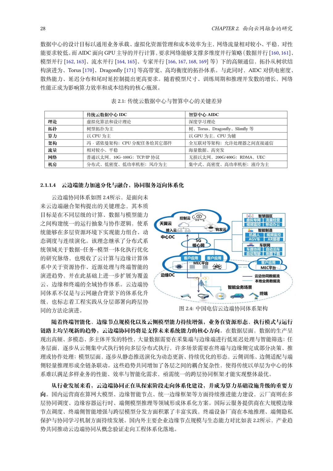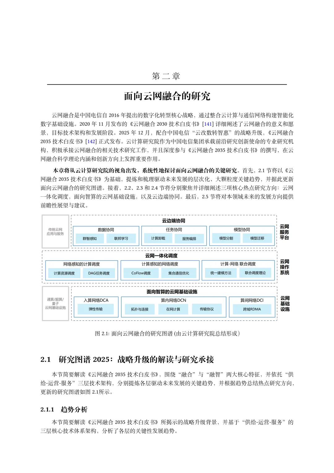 第二章,面向云网融合的研究,本年度围绕的重点是中国电信 2025 战略升级 – 云改数转智惠,一方面分析解读,另一方面探讨在理论研究和技术创新上的承接方向。首先借用云计算研究院参与撰写,于年底发布的《云网融合 2035 技术白皮书》,阐述战略升级的核心驱动力、云网融合的科学理论内涵以及由供给-运营-服务的三层体系构成的核心愿景架构。然后在三层架构上分别识别出前沿技术趋势,分别是云网一体化调度依然是核心、网络基础设施 DC 向 AIDC 全面转型和云边端能力加速分化与融合,并由此引出本章的三个热点方向:(4)云网一体化调度(5)面向智算的云网基础设施(6)云边端协同。