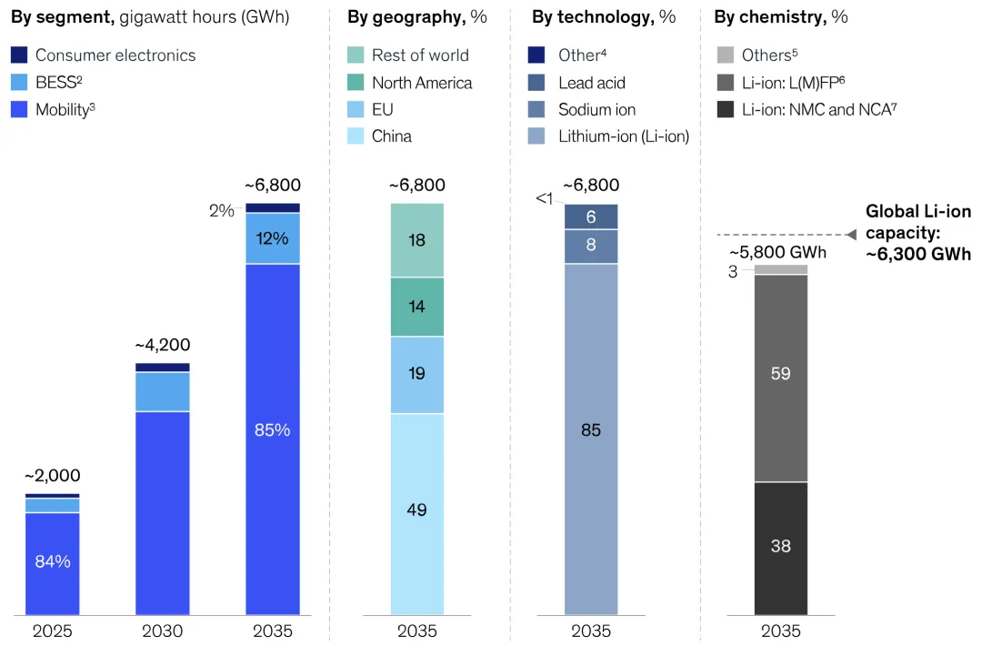 2025-2035年全球电池需求及市场细分(按领域、地区、技术、化学体系)