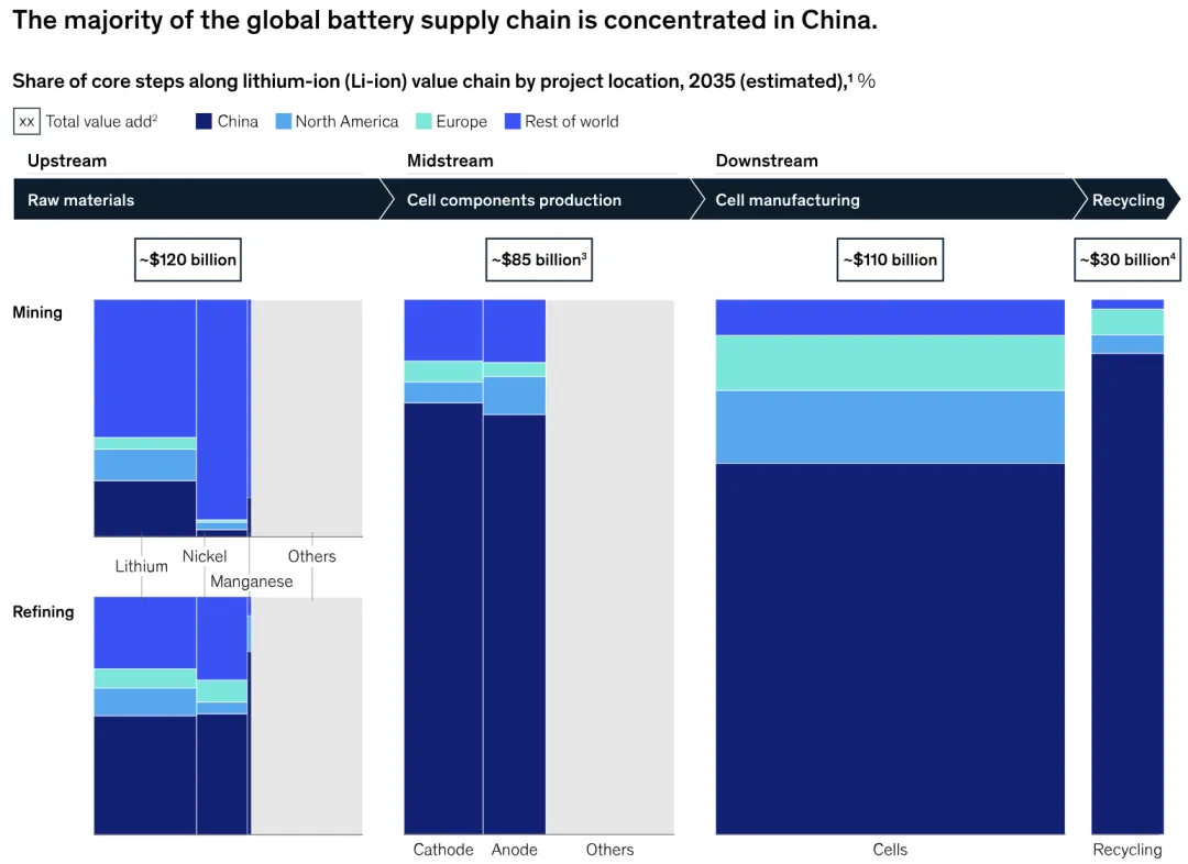 当前全球锂电池价值链呈现显著的区域失衡:亚洲占据上游矿产加工、中游材料制造与下游电芯生产的主导地位,欧美在阳极石墨、正极前驱体等中游环节的全球份额不足10%。为降低对亚洲供应链的依赖,欧美正通过政策激励与产业投资,推动区域化供应链建设。