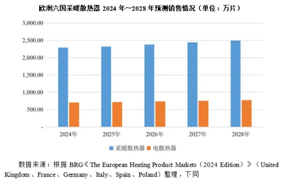 欧洲以温带为主,受海洋影响,全年温和多雨。以英国为例,终年受西风和海洋的影响,全年气候温和湿润,通常最高气温不超过32℃,最低气温不低于零下10℃,1月平均气温4~7℃,7月13~17℃,全年气候温和湿润,但天气多变,年平均降水量约1,000毫米。受气候及生活方式等影响,采暖散热器在欧洲较为普及。以英国、法国、德国、波兰、意大利、西班牙六国为例,根据BRG关于采暖散热器的统计数据,2012年至2023年,上述六个国家中各类采暖散热器合计销量虽然总体处于波动状态,但基本维持在每年2,800万片左右;其中英国、德国、法国的市场规模相对较大,2024年-2028年,英国市场平均需求约为800万片/年、德国市场约为420万片/年、法国市场约为517万片/年,市场需求较大。同时,上述六个国家中电热散热器的占比逐步提升,其中法国的电热散热器销量占比从60%逐步提升至70%以上,其他国家虽以水暖为主,但电热散热器均呈增长态势。除上述六个国家外,采暖散热器在爱尔兰、比利时等其他欧洲国家也拥有较大的市场规模。