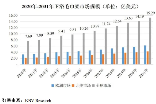 卫浴毛巾架产品除用于家庭住宅领域外,还广泛应用于泳池房、桑拿房、游艇、酒店、健身房和其他体育设施等商业领域。根据KBV Research的研究报告,卫浴毛巾架产品的市场规模从2020年的7.69亿美元增长到2024年的9.81亿美元,其中欧洲市场占比约为42%左右,预计到2031年,卫浴毛巾架市场规模将达到15.29亿美元,其中欧洲市场仍占比40.65%。