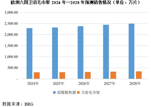 散热器的统计数据,在2012年至2023年期间,采暖散热器销量总体相对平稳,上述六个国家的卫浴毛巾架的销量保持相对稳定,但卫浴毛巾架产品的市场占有率由2012年的10.85%上升到2023年13%左右,其中2023年德国、意大利市场占比可达到20%左右,相当于每销售5片采暖散热器产品中就有1片为卫浴毛巾架,卫浴毛巾架的市场需求持续旺盛,市场占有率逐年增长。