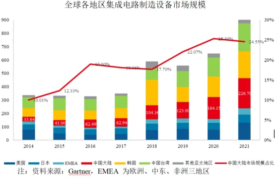 中国大陆集成电路制造设备行业起步较晚,但随着半导体第三次产业转移、国家对集成电路行业的高度重视以及国内企业多年的技术研发和积累,集成电路制造设备市场近年迎来了高速增长。根据Gartner统计数据,2014年中国大陆集成电路制造设备市场规模仅为33.64亿美元;2021年,中国大陆集成电路制造设备市场规模达226.70亿美元,全球规模占比增长至24.55%,年复合增速达31.33%。