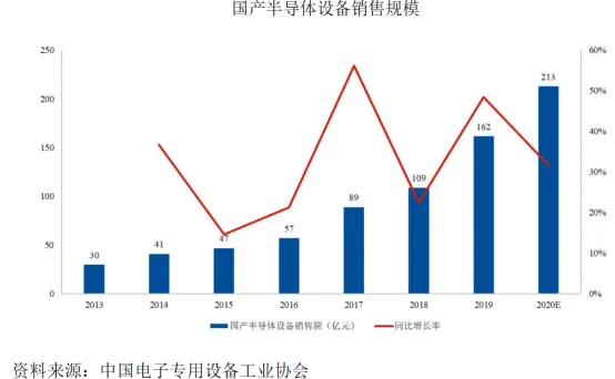 尽管中国大陆集成电路制造设备市场规模在不断提升之中,但主要核心集成电路制造设备仍依赖于进口,国产化能力亟待提升。在政策红利、全球贸易摩擦、社会资本涌入等内外部因素综合推动下,中国大陆集成电路行业生态圈逐步优化,各类国产集成电路制造设备加速客户导入,国内企业实力逐步增强。根据中国半导体设备年会统计数据,近年来国产集成电路制造设备销售规模保持高速增长。在国内日益增长的集成电路制造需求及保障行业供应链安全的战略目标下,国产集成电路制造设备发展空间广阔。随着国产集成电路制造设备产业的迅速发展,未来国产集成电路制造设备种类将不断增加,性能也将不断提升,市场占有率将显著提高。
