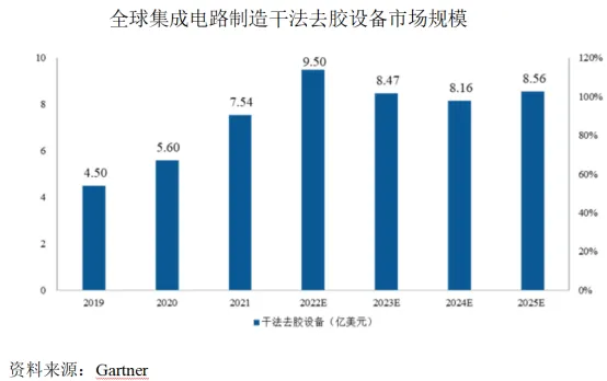 在最先进的芯片制造工艺中,对底层材料的保护要求已达到原子级。干法去胶设备技术要求不断提高,干法去胶逐渐成为先进光刻中的一道关键步骤,设备应用也不断扩大。根据Gartner统计数据,2021年全球集成电路制造干法去胶设备市场规模为7.54亿美元,预计2022年将达到9.50亿美元。