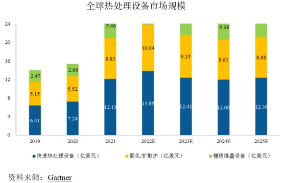根据Gartner统计数据,2021年全球热处理设备市场规模合计26.42亿美元,其中快速热处理设备市场规模为12.13亿美元,氧化/扩散设备市场规模约8.83亿美元,栅极堆叠(Gate Stack)设备市场规模为5.46亿美元。2022年快速热处理设备市场规模有望达到13.85亿美元。