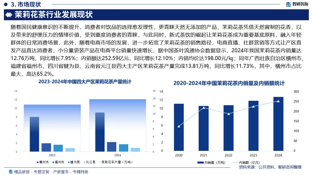 茉莉花茶多以绿茶为茶坯(也有部分企业以红茶、乌龙茶等作为茶坯原料),搭配茉莉鲜花窨制而成,既有绿茶的清爽,又融入了茉莉花的馥郁芬芳,是中国传统花茶中的经典品类。随着国民健康意识的不断提升,消费者对饮品的选择愈发理性,更青睐天然无添加的产品,茉莉花茶凭借天然窨制的花香,以及带来的舒缓压力的情绪价值,受到重度消费者的青睐。与此同时,新式茶饮的崛起让茉莉花茶成为重要基底原料,融入年轻群体的日常消费场景,此外,随着电商市场的发展,进一步拓宽了茉莉花茶的销售路径,电商直播、社群营销等方式让产区直发产品直达消费者,小分量袋装产品在电商平台销量快速增长。据中国茶叶流通协会数据显示,2024年我国茉莉花茶内销量达12.76万吨,同比增长7.95%;内销额达252.59亿元,同比增长12.10%;内销均价达198.00元/㎏。