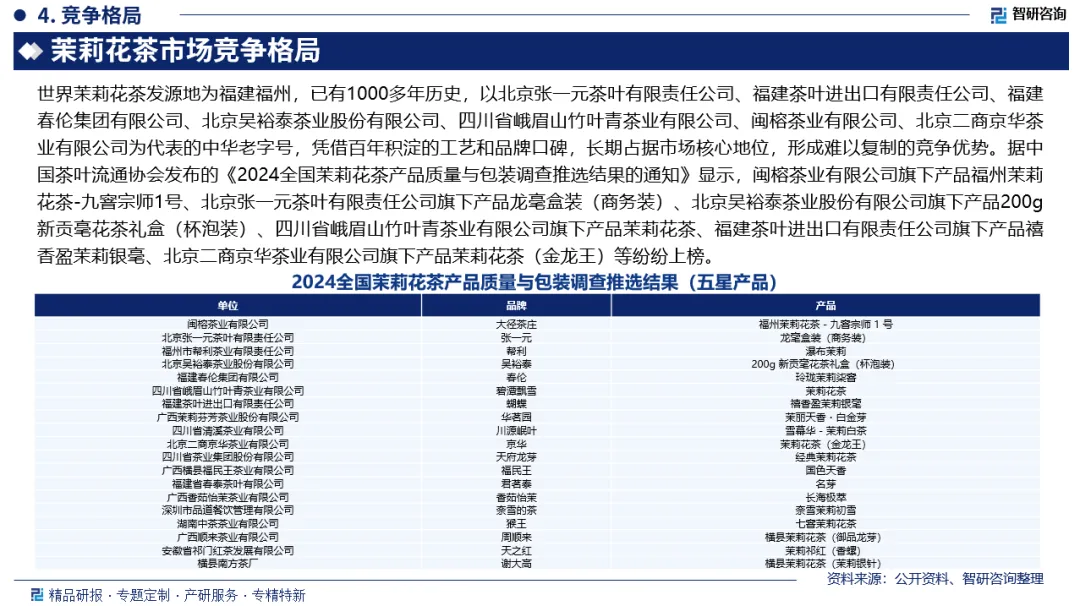 市场竞争格局:世界茉莉花茶发源地为福建福州,已有1000多年历史,以北京张一元茶叶有限责任公司、福建茶叶进出口有限责任公司、福建春伦集团有限公司、北京吴裕泰茶业股份有限公司、四川省峨眉山竹叶青茶业有限公司、闽榕茶业有限公司、北京二商京华茶业有限公司为代表的中华老字号,凭借百年积淀的工艺和品牌口碑,长期占据市场核心地位,形成难以复制的竞争优势。