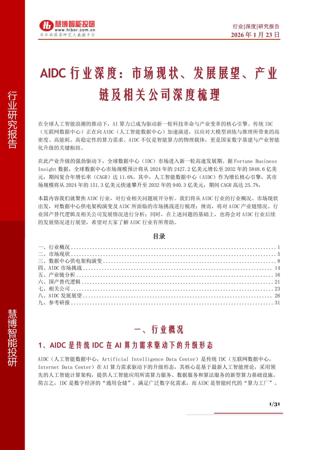 本篇内容我们就聚焦AIDC行业,对行业相关问题展开分析。我们将从AIDC行业的行业概况、市场现状出发,对数据中心供电架构演变及AIDC所面临的市场挑战进行梳理;继而,将对AIDC产业链情况、行业国产替代逻辑及相关公司发展情况进行分析;同时,在上述问题的基础上,也将会对AIDC行业后续的发展情况进行展望,希望对大家了解AIDC行业有所帮助。