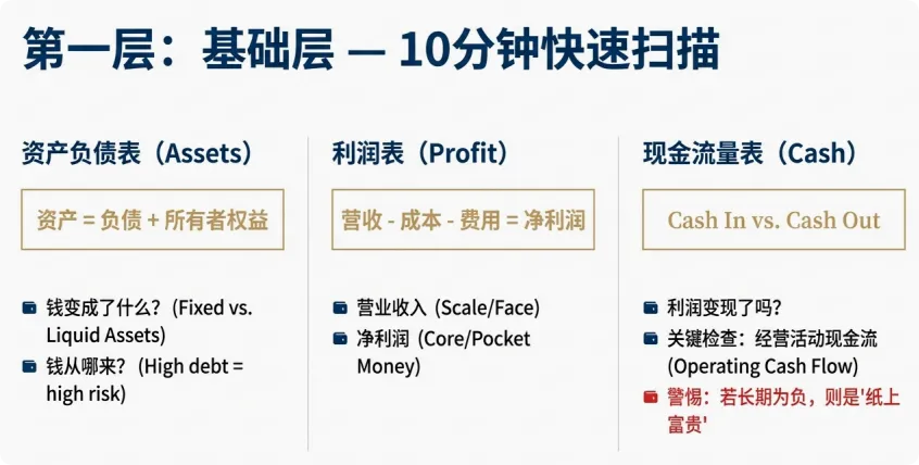 小结: 基础层是定性了解。通过三张表,你大概能知道这是一家重资产还是轻资产公司,生意赚不赚钱,现金流是否健康。