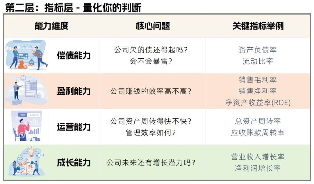 如果说看懂三张表是“定性”分析,那么计算核心财务指标就是“定量”分析,让你的判断有数据支撑。指标虽多,但万变不离其宗,主要围绕四个核心能力展开。