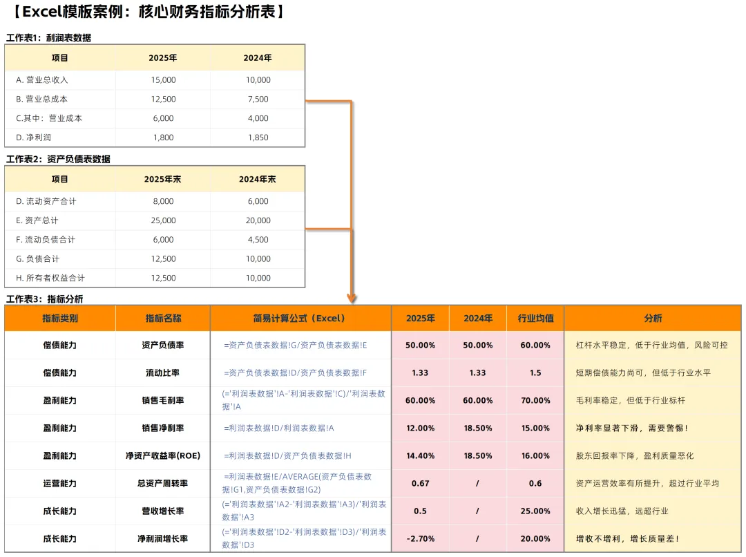 你可以建立一个Excel文件,包含三个工作表:“利润表数据”、“资产负债表数据”和“指标分析”。