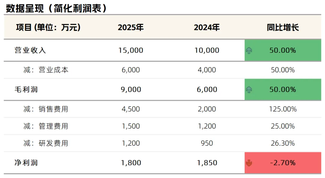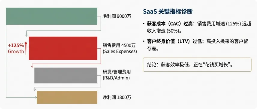 深入探查:问题出在哪里?我们沿着利润表往下看,发现毛利润的增长和收入是同步的(50%),说明产品本身的定价和成本控制没问题。问题出在费用端。销售费用从2000万暴增至4500万,增长了125%,其增速远超收入增速,是吞噬利润的罪魁祸首。