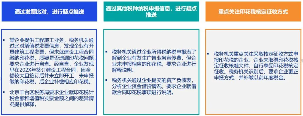 2.借助其他税种信息比对发现问题,比如企业所得税申报了广宣费却未申报广告合同印花税,财务报表显示有借贷资金却未申报借款合同印花税,均可能被纳入风险排查。