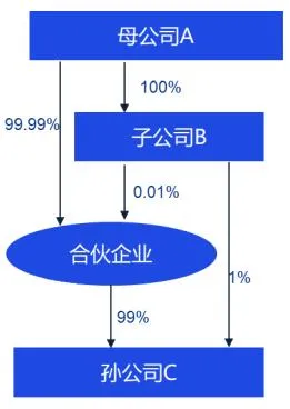 案例背景:母公司 A100%控股子公司 B,另有合伙企业及孙公司,目标是压缩层级,使孙公司直接由 B 持有。从印花税角度,两种重组方案。