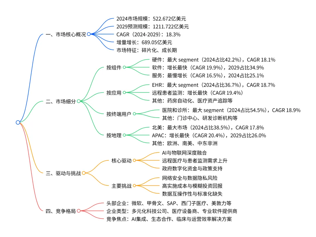 2024-2029 年全球智能医院市场呈高速增长态势,2024 年市场规模达522.672 亿美元,预计 2029 年将增至1211.722 亿美元,期间复合年增长率(CAGR)为 18.3%,增量增长达689.05 亿美元;市场结构呈碎片化,硬件是最大组成部分(2024 年占比 42.2%),软件为增长最快细分领域(CAGR 19.9%);应用层面以电子健康记录(EHR) 为主导,远程患者监测增长最快(CAGR 19.4%);终端用户中医院和诊所贡献最大(2024 年占比 54.5%);地理上北美是最大市场(2024 年占比 38.5%),亚太地区(APAC) 增长最快(CAGR 20.4%);核心驱动因素包括 AI 与物联网融合、远程医疗需求升级及政府数字化投入,主要挑战为网络安全风险、高实施成本及数据互操作性不足,市场竞争集中于微软、甲骨文、西门子医疗等企业。