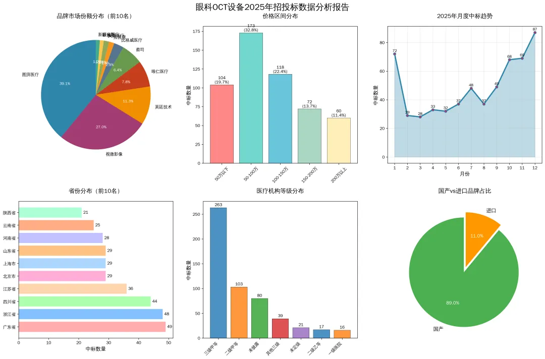 仅公开数据来看,年度市场规模已突破 6.7 亿元,相较于往年数据(弗若斯特沙利文:眼科OCT 2023年度公立医院中标公开可查询台数为404台),对比 2023-2025 年的增长轨迹,年均增速或超 21%,远高于医疗设备行业整体 5-8% 的平均增速,成为高端医疗设备领域的高增长赛道,展现出眼科设备市场的抗周期性和长期增长潜力; 三级医院的高端采购需求(200 万以上设备占比 11.4%)与基层医疗机构的基础需求(50 万以下占比 19.7%)形成双轮驱动,市场结构更趋健康。