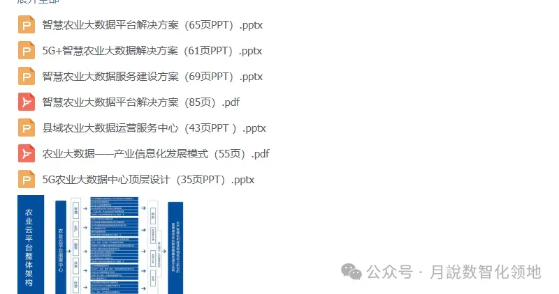 智慧农业大数据平台解决方案(65页PPT).pptx 5G+智慧农业大数据解决方案(61页PPT).pptx 智慧农业大数据服务建设方案(69页PPT).pptx 智慧农业大数据平台解决方案(85页).pdf 县域农业大数据运营服务中心(43页PPT ).pptx 农业大数据——产业信息化发展模式(55页).pdf 5G农业大数据中心顶层设计(35页PPT).pptx ····