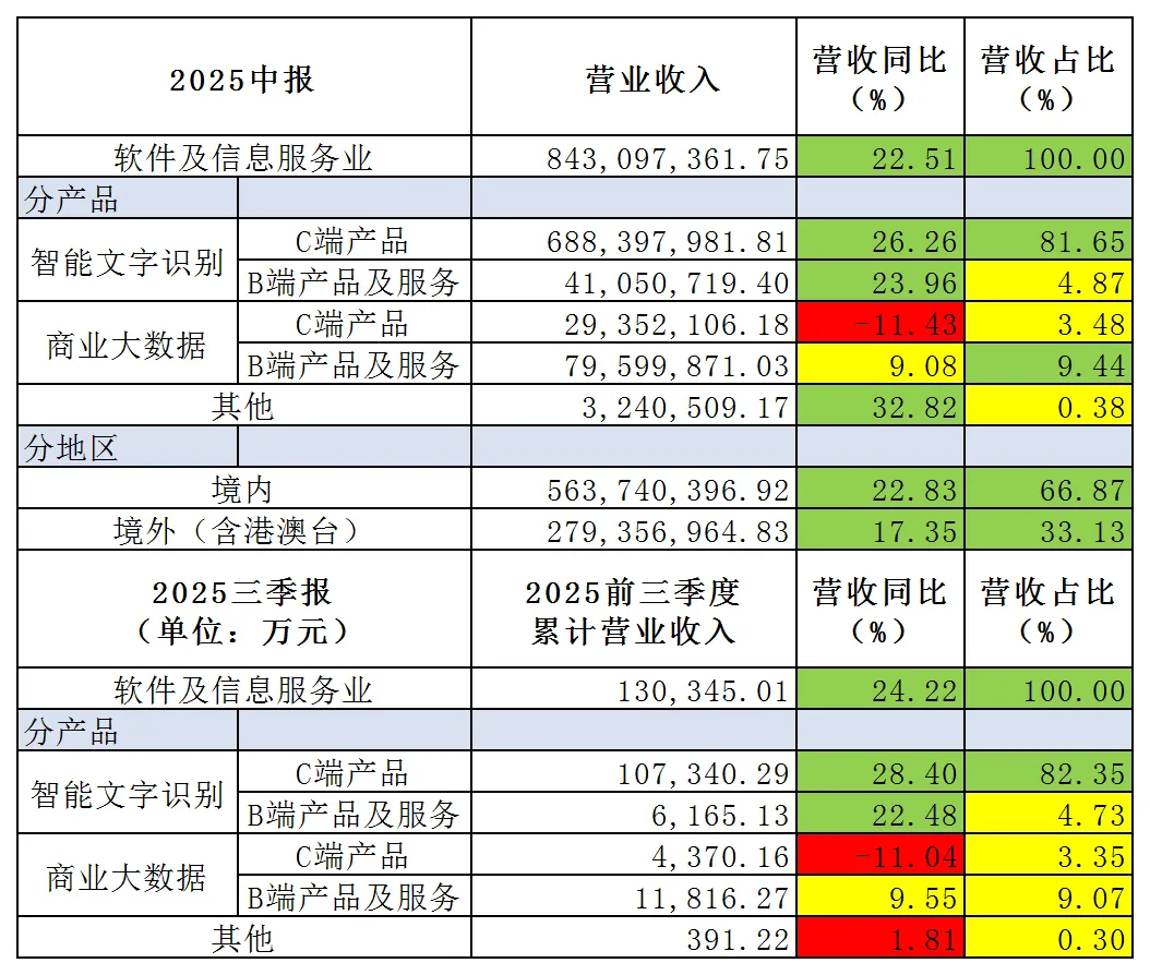 2025上半年,公司智能文字识别C端产品累计实现营业收入6.88亿元,同比增长26.26%,占比81.65%;2025前三季度累计实现营业收入10.73亿元,同比增长28.4%,占比提升至82.34%。