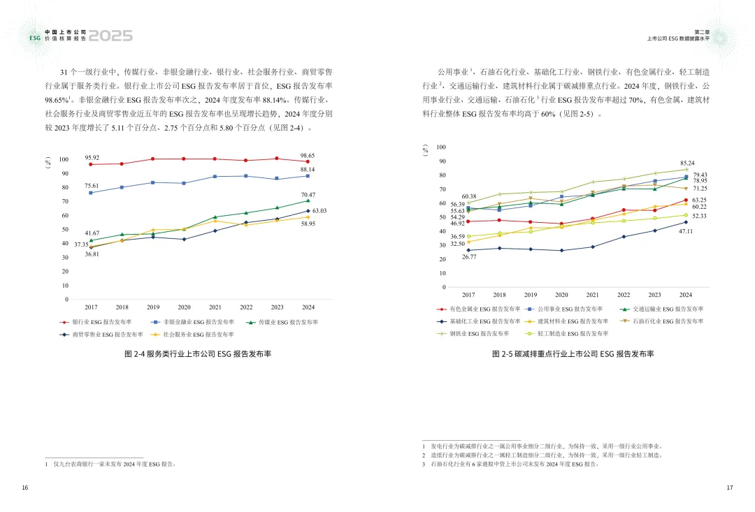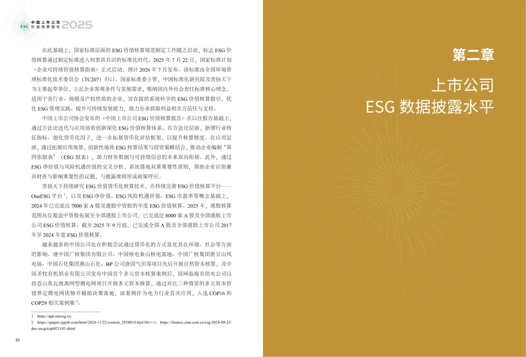 中国上市公司协会与责扬天下(北京)管理顾问有限公司联合发布的《2025年中国上市公司ESG价值核算报告》,系统梳理了近年来国内外在环境与社会影响核算方面的研究成果和实践进展。ESG价值核算通过量化企业在环境和社会方面的外部性影响,为评估公司可持续表现提供了直观的货币化工具。A股及港交所上市的内地公司ESG报告发布数量持续增长,关键指标披露率逐年提升,数据质量明显改善。2024年二氧化碳排放数据质量达到A级的公司数量较2022年增长超过50%。在ESG价值核算方面,实现正面净影响的公司数量持续增加,环境与资源使用强度有所下降,社会价值创造能力不断提升。报告还分析了ESG价值核算在投资领域的应用。通过因子分析验证了多个ESG价值核算指标的有效性,结果显示多数指标具备良好的稳定性和相关性。以ESG风险机遇价值为选股因子构建的投资组合,在回测中表现出正向超额收益,表明ESG价值核算数据在投资策略中具有实际应用价值。在企业运营层面,ESG价值核算可支持双重重要性分析,帮助企业优化信息披露和管理决策。随着《企业可持续价值核算指南》国家标准的推进,ESG价值核算逐步走向标准化,为企业提供系统、科学的指导,助力提升可持续发展能力。国际上,多元资本联盟与国际影响力估值基金会于2024年发布多项整合指引,并计划共建全球统一价值核算数据库。ISSB也对ESG披露标准进行修订,推动行业框架互操作性提升。这些动态反映出全球对ESG价值核算体系的重视与探索。
