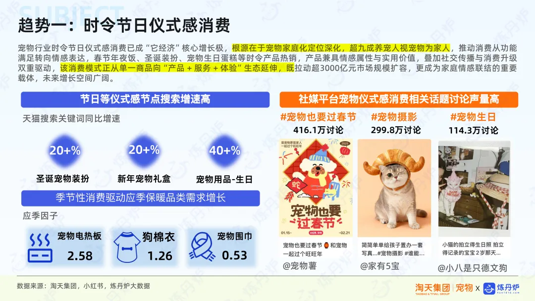 超九成养宠人将宠物视为家庭一员,推动消费需求向情感表达维度升级,时令节日仪式感消费成为核心增长抓手。春节宠物年夜饭、圣诞主题装扮、宠物生日蛋糕等产品持续热销,#宠物也要过春节#话题累计讨论量达416.1万,新年宠物礼盒、宠物生日用品搜索增速分别高达40%+、20%+。好利来宠物专属蛋糕、帕特马年限定礼盒等新品,凭借氛围感包装与适配宠物肠胃的健康配方,精准承接宠主的仪式感诉求。