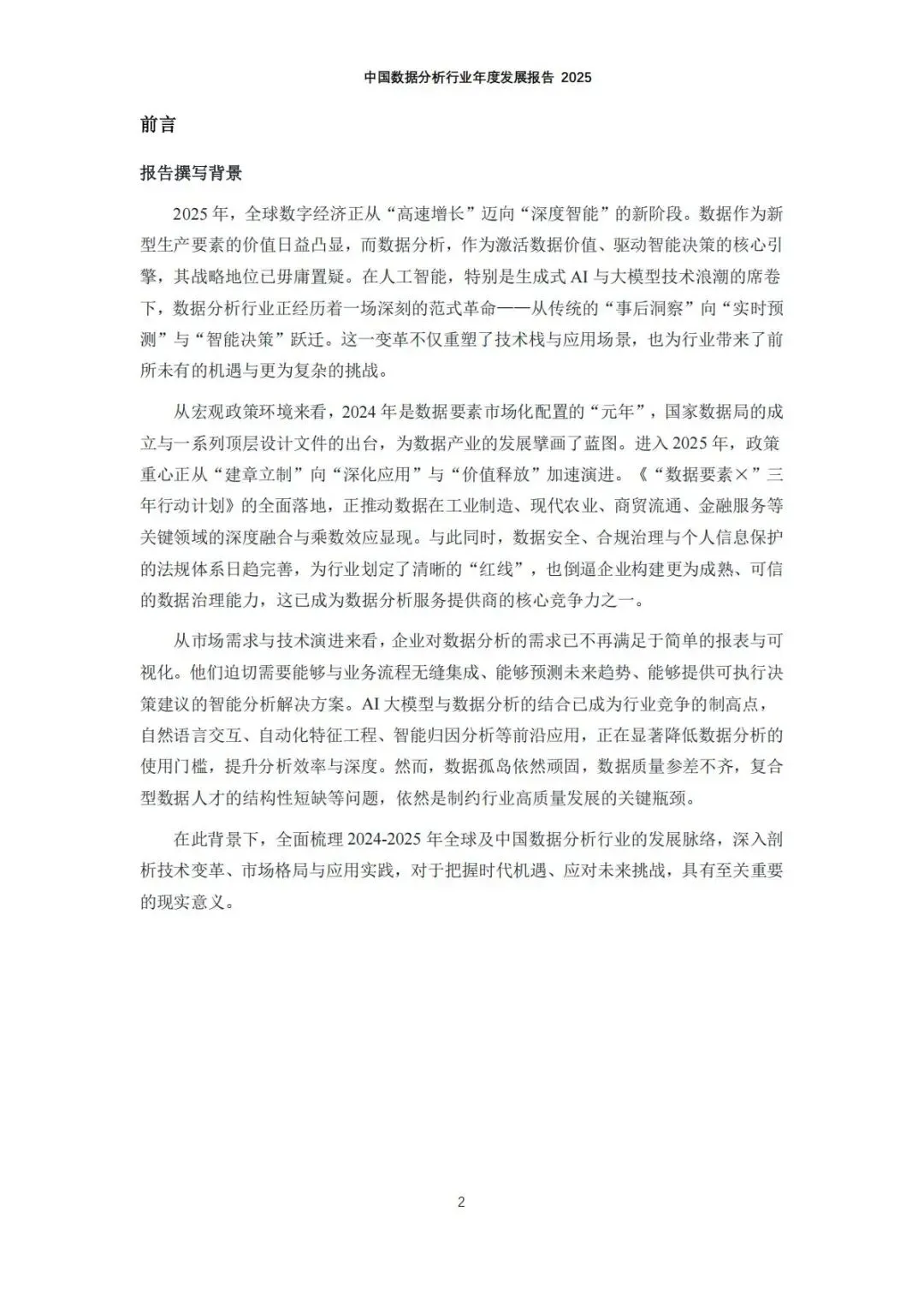 2025年,全球数字经济正从“高速增长”迈向“深度智能”的新阶段。数据作为新型生产要素的价值日益凸显,而数据分析,作为激活数据价值、驱动智能决策的核心引擎,其战略地位已毋庸置疑。在人工智能,特别是生成式AI与大模型技术浪潮的席卷下,数据分析行业正经历着一场深刻的范式革命——从传统的“事后洞察”向“实时预测”与“智能决策”跃迁。这一变革不仅重塑了技术栈与应用场景,也为行业带来了前所未有的机遇与更为复杂的挑战。