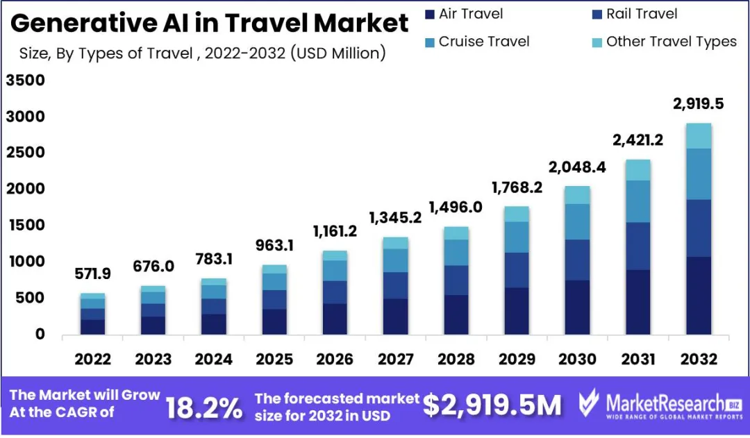 首先,让我们通过数据来感受这场变革的规模。根据MarketResearch.biz的报告,生成式AI在旅游市场的规模正以18.2%的复合年增长率快速扩张,预计到2032年将达到2919.5百万美元。从图表中可以清晰地看到,2025年市场规模为963.1百万美元,而到2026年这一数字将跃升至1161.2百万美元,一年间增长近200百万美元。