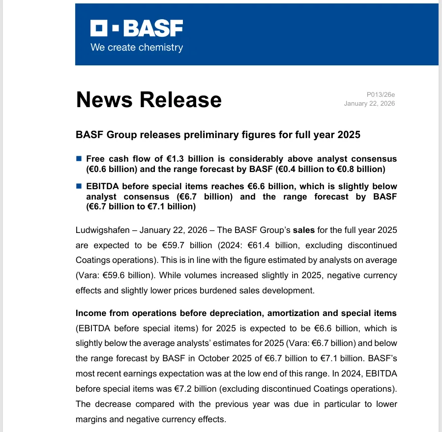 另据巴斯夫官网消息,巴斯夫集团2025年正式财务报告将于2026年2月27日发布。分析师和投资者电话会议定于当天上午9:00~10:00(欧洲中部时间)举行;年度新闻发布会将于当天上午10:30~11:30(欧洲中部时间)举行。