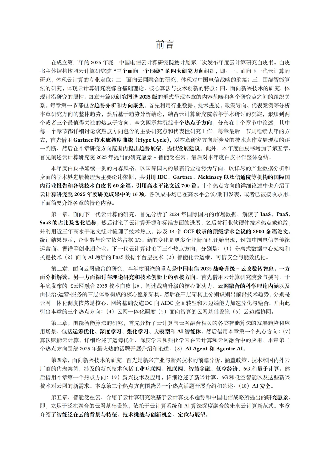 《中国电信云计算研究白皮书(2025)》是由中国电信云计算研究院发布的年度研究报告,系统梳理了云计算领域的前沿技术、产业趋势与中国电信的战略布局。白皮书围绕“三个面向一个围绕”的四大研究方向展开,包括: