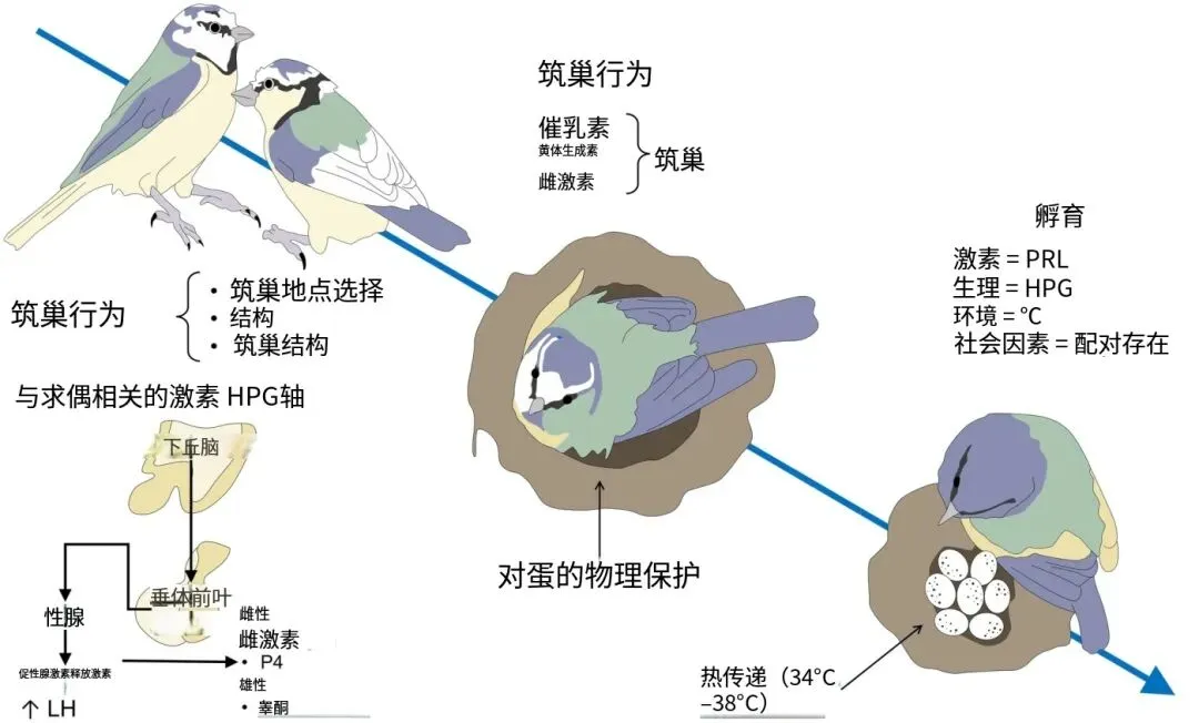 中型鸟类:行为模式更具隐蔽性,常伴随筑巢材料收集等前驱行为