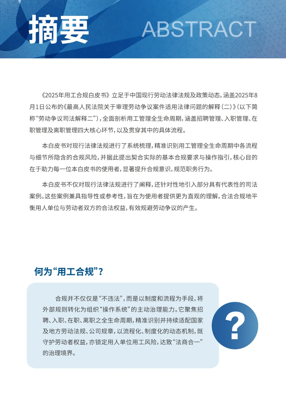 《2025年用工合规白皮书》立足于中国现行劳动法律法规及政策动态,涵盖2025年8月1日公布的《最高人民法院关于审理劳动争议案件适用法律问题的解释(二)》(以下简称“劳动争议司法解释二”),全面剖析用工管理全生命周期,涵盖招聘管理、入职管理、在职管理及离职管理四大核心环节,以及贯穿其中的具体流程。