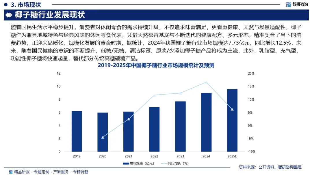 椰子糖是以椰子原汁、白砂糖、淀粉糖浆、凝胶剂等为原料,按照一定工艺加工而成的糖块。随着国民生活水平稳步提升,消费者对休闲零食的需求持续升级,不仅追求味蕾满足,更看重健康、天然与场景适配性,椰子糖作为兼具地域特色与经典风味的休闲零食代表,凭借天然椰香基底与不断迭代的健康配方、多元形态,精准契合了当下的消费趋势,正迎来品质化、规模化发展的黄金时期,据统计,2024年我国椰子糖行业市场规模达7.73亿元,同比增长12.5%,未来,随着国民健康的意识的不断提升,低糖/无糖、清洁标签、原浆/少添加椰子糖产品将成为主流,此外,乳脂型、充气型、功能性椰子糖将快速起量,替代部分传统高糖硬糖产品。