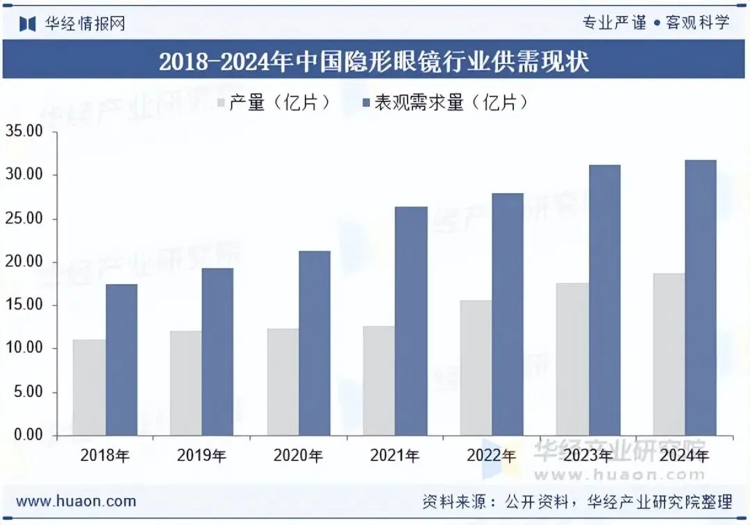 隐形眼镜兼具医疗和消费双重属性,随着我国近视人群规模持续扩大以及消费能力的提升,部分近视患者出于美观、运动、工作等方面的原因而产生摘镜需求,使得隐形眼镜的市场渗透率不断提升。据统计,截至2024年我国隐形眼镜行业产量为18.78亿片,需求量为31.87亿片。
