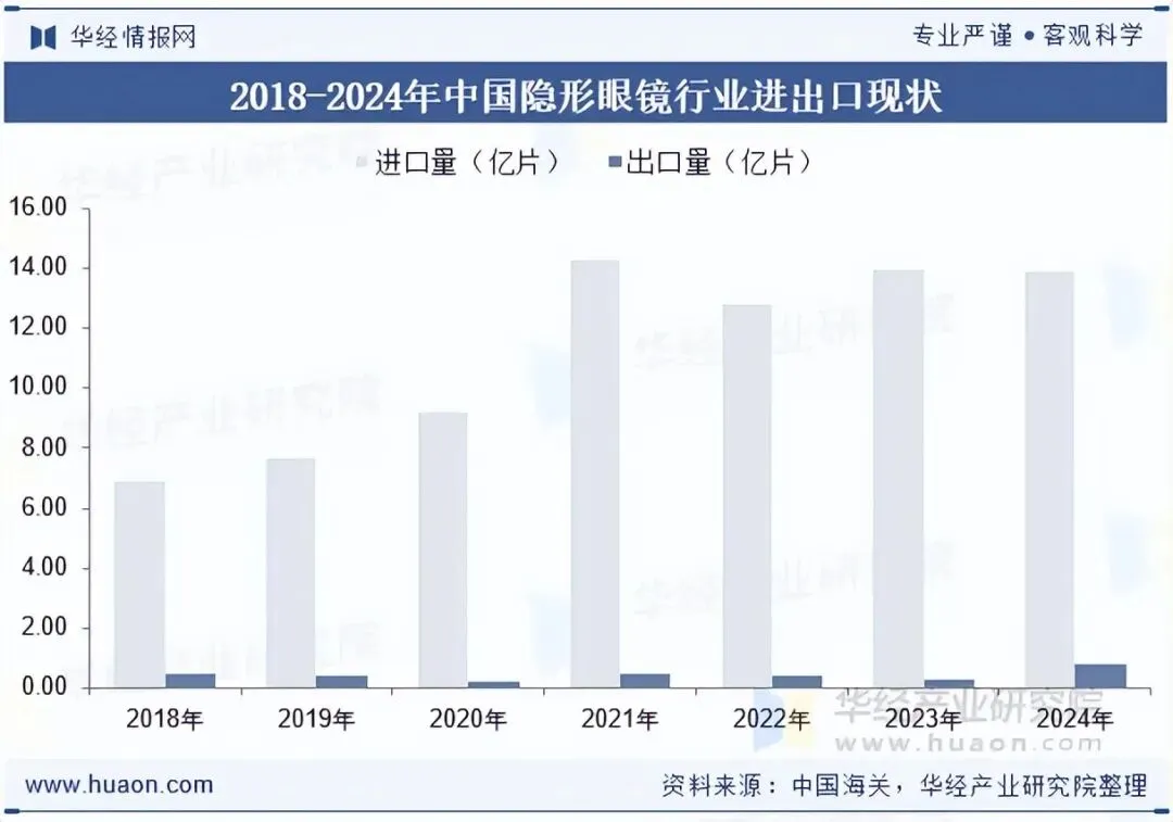 由于硅水凝胶隐形眼镜目前在国内的生产品牌极少,因此主要依赖进口产品。数据显示,我国隐形眼镜片的进口量快速上升,截至2024年我国隐形眼镜进口量为13.91亿片,略低于2023年的13.94亿片;2024年我国隐形眼镜出口量为0.82亿片,同比增长192.86%。
