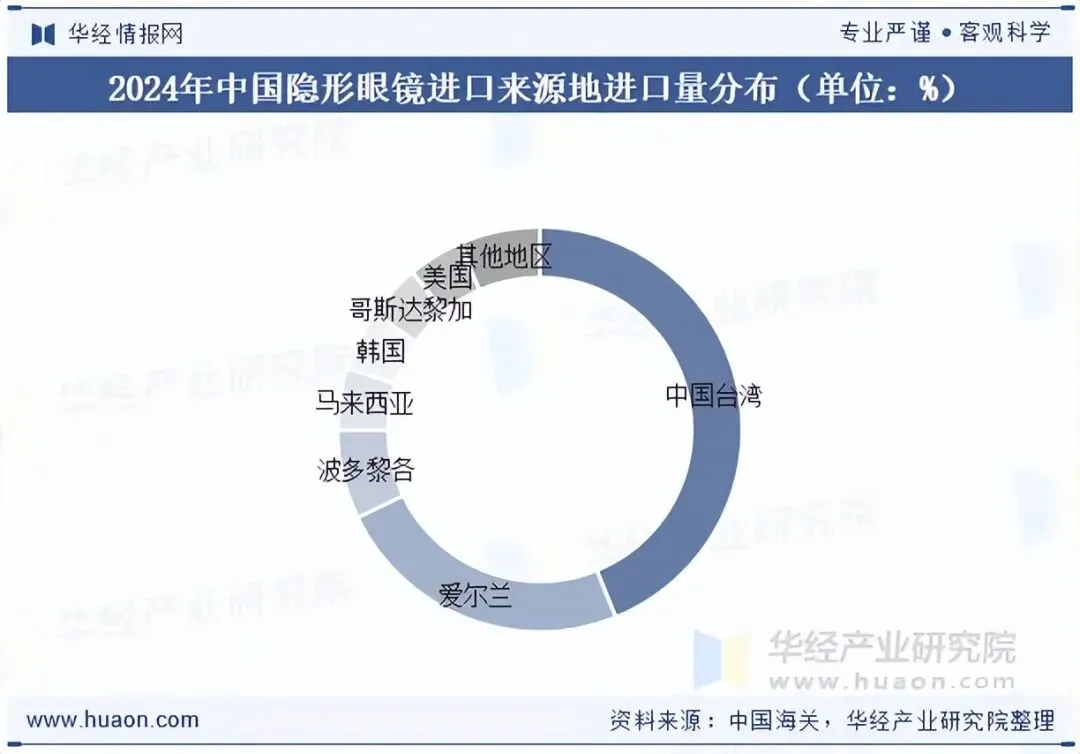 从我国隐形眼镜进口来源地进口量来看,2024年我国共从28个国家和地区进口隐形眼镜,其中进口量排前七的分别是中国台湾、爱尔兰、波多黎各、马来西亚、韩国、哥斯达黎加与美国,前七地区隐形眼镜进口量合计占比93.51%,其他地区隐形眼镜进口量占比6.49%。