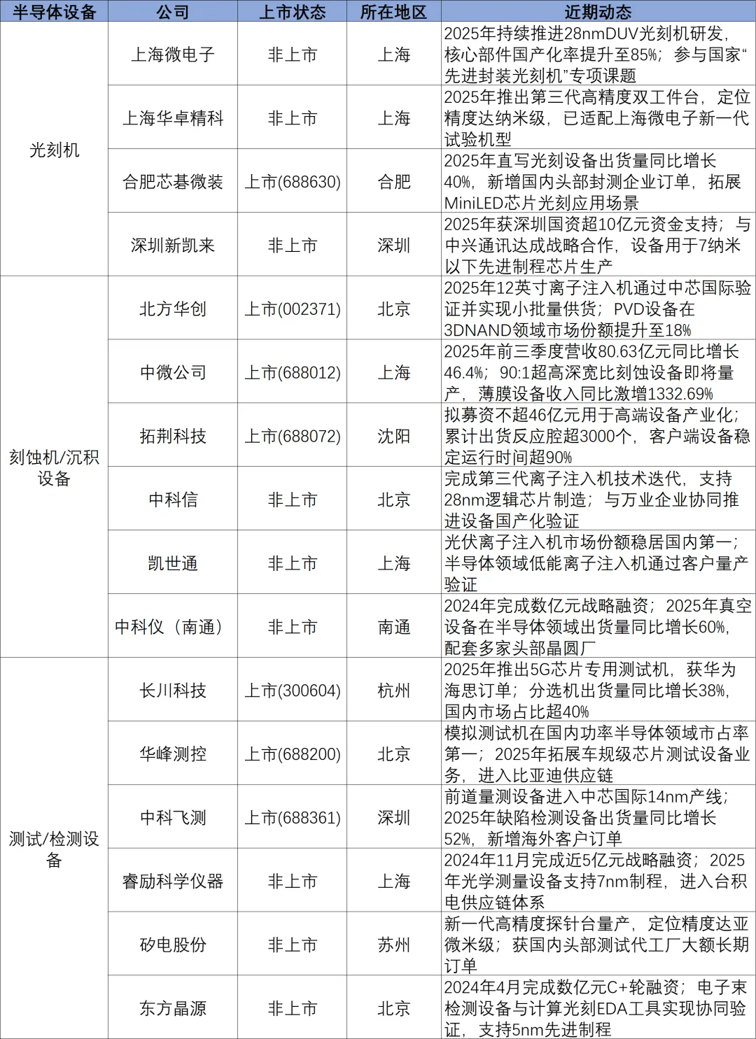 刻蚀机 / 沉积设备:北方华创、中微公司、拓荆科技、盛美上海、华海清科、芯源微、屹唐股份、中科信、凯世通、中科仪(南通)、新松半导体、芯上微装、尚矩半导体、青岛思锐智能、芯矽科技、北京烁科。
