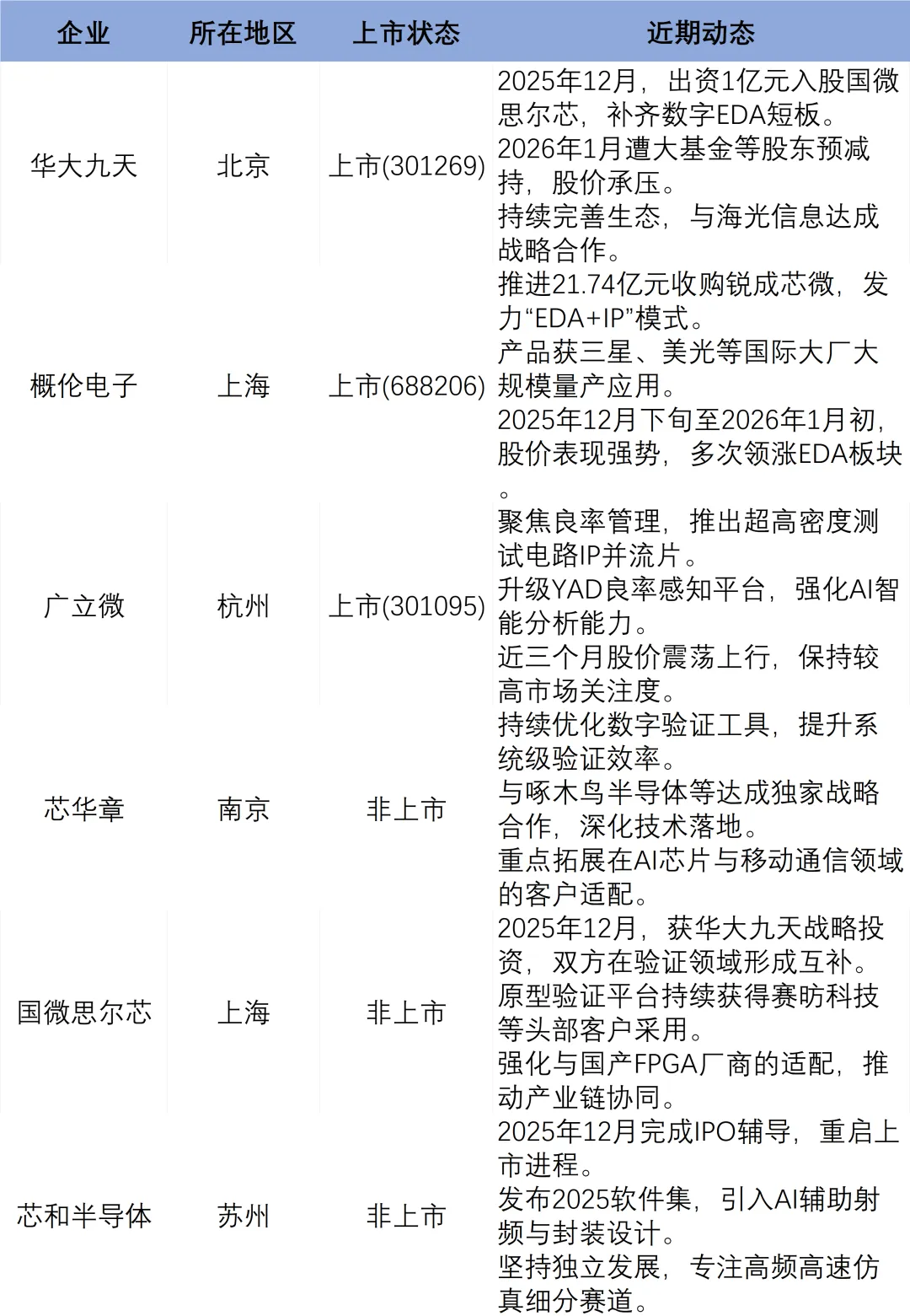 核心厂商:华大九天、概伦电子、广立微、芯原股份、全芯智造、芯华章、国微思尔芯、芯和半导体、行芯科技、博达微电子、九同方、中科亿海微、鸿芯微纳、奥卡思微、珂晶达、蓝海微、若贝科技