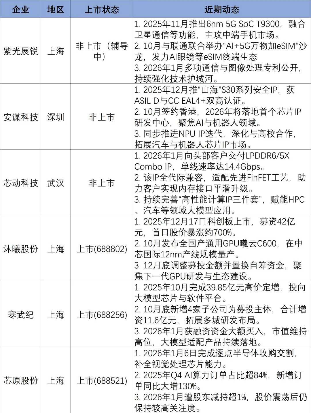 GPU:沐曦股份、摩尔线程、壁仞科技、景嘉微、华为海思、燧原科技、芯动科技。