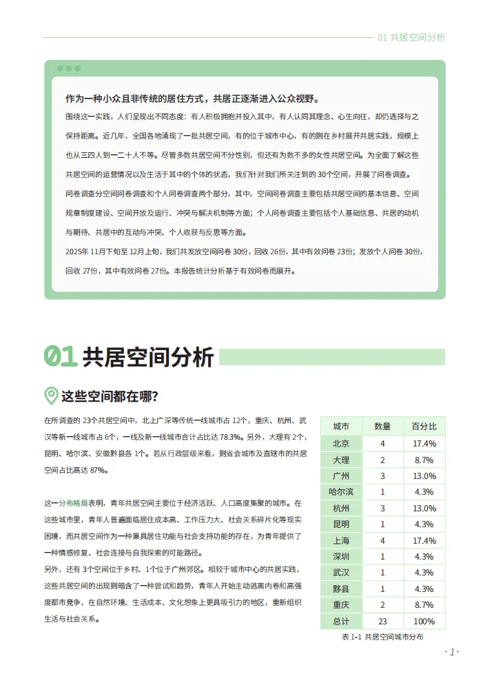 共居作为区别于传统合租的新型居住方式,以“社群主导”为核心,兼具私人空间与共享设施,强调居住者共同设计管理、分工协作与情感联结,被视为“更像家的地方”。其分布集中于一线及新一线城市(占比78.3%),同时乡村与郊区的实践也展现出青年逃离都市内卷的趋势。空间成立时间多集中于近2年,61%为新晋成立,反映出共居方式正逐步被青年认可。