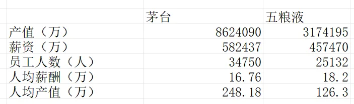 这样一组数据很明显的对比出,茅台薪资低,产出高;五粮液反之。