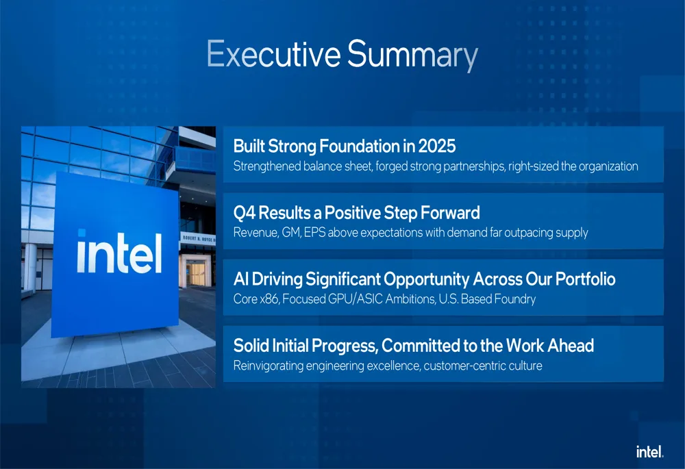 英特尔首席财务官David Zinsner表示:“尽管面临全行业供应短缺的挑战,公司第四季度的营收、毛利率和每股收益方面均超出预期。公司预计,可用供应量将在第一季度降至最低水平,随后从第二季度起逐步改善。随着AI的快速普及,x86生态系统作为全球广泛部署的高性能计算架构的重要性日益凸显,核心市场的基本面需求依然稳健。”