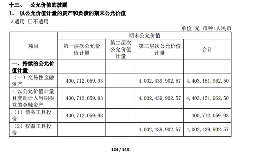 答:2023年财报这里就披露了,茅台以公允价值计量的资产,只有交易性金融资产4亿元。相当于买了39亿,卖出35亿,中间增值了2407万左右,最后剩4亿元。