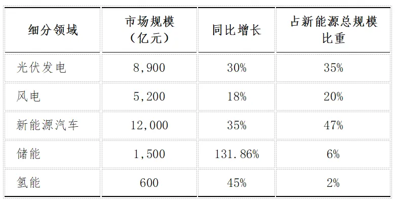 细分领域贡献度:2024年我国新能源细分领域市场规模及占比见下表: