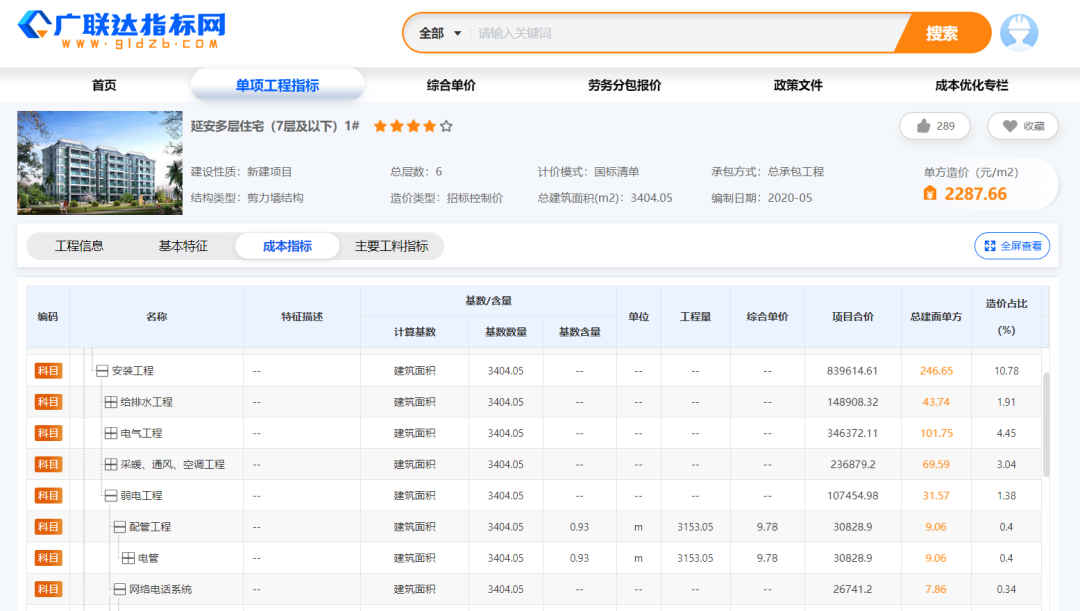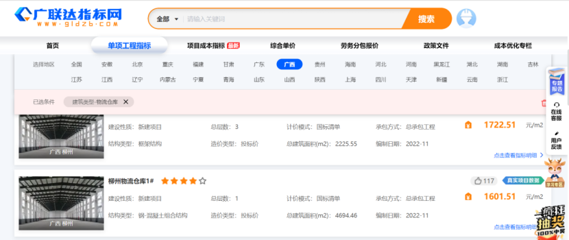 ①项目中的需要的多种建筑类型的指标直接在指标网的单项工程指标模块参考,按照地区,建筑类型,编制时间等相关信息筛选和自己项目相似的工程做估算参考;