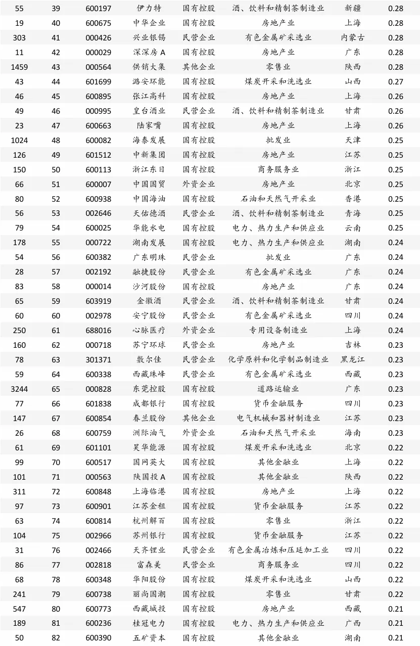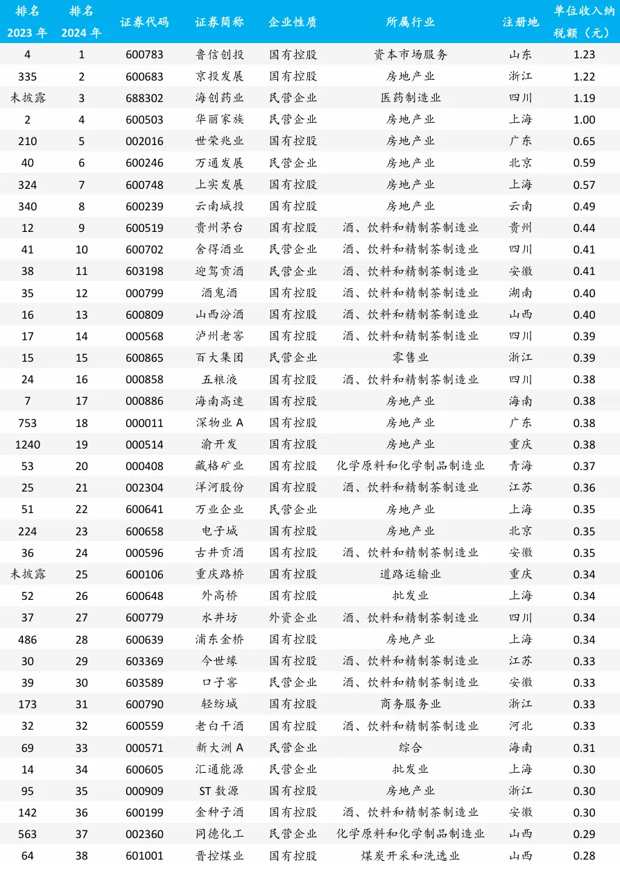2024年,单位收入纳税额前100名上市公司的单位收入纳税额都大于0.19,意味着综合税负率都超过19%,远高于全国平均水平。其中,鲁信创投、京投发展和海创药业三家企业的单位收入纳税额均超过1,可能是由于业务特殊性或税费预缴、往期补缴等非常态税款缴纳因素,导致营业总收入相较其实际纳税额偏低。