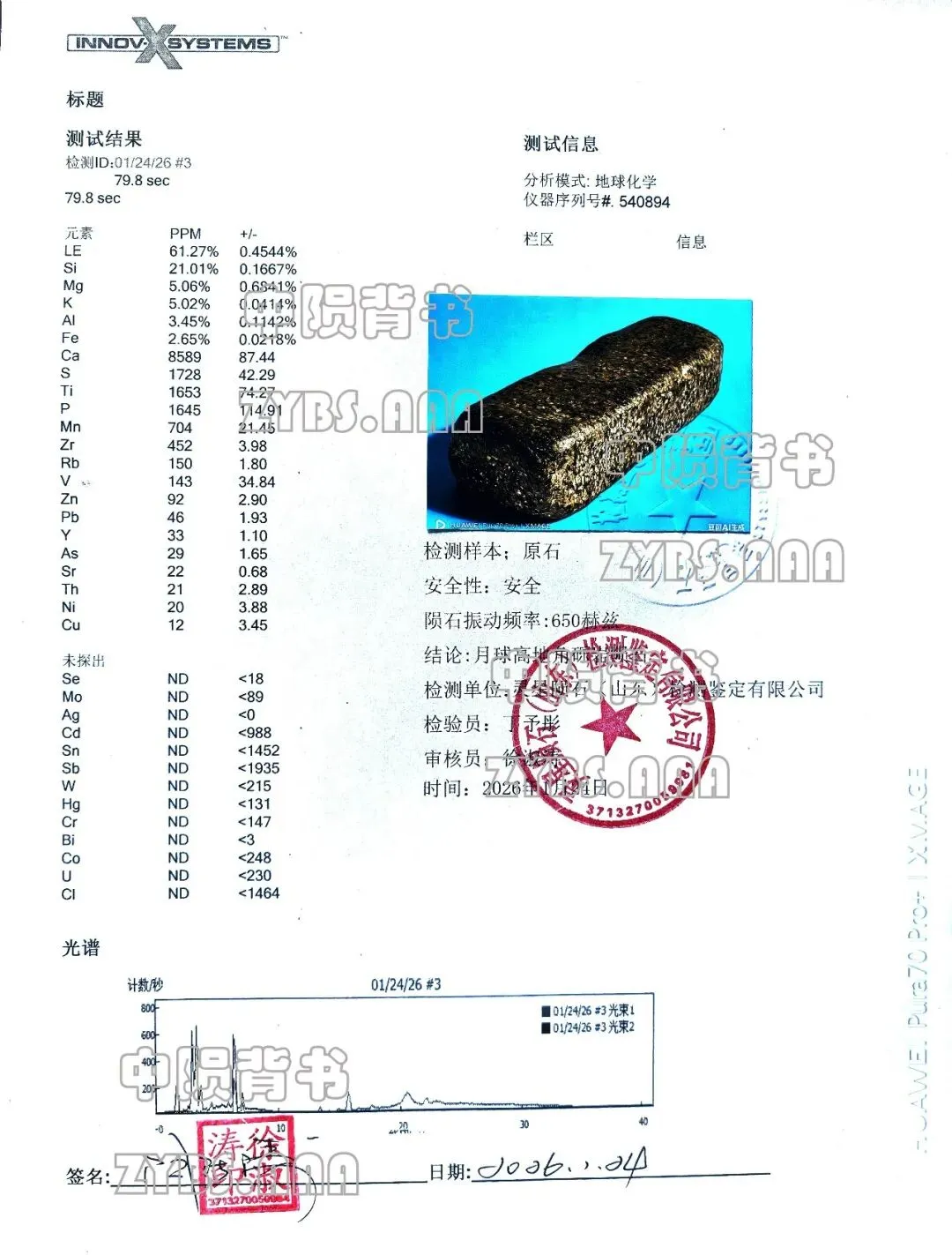 检测出多种微量元素,其中含量较高的包括氧化钙8589ppm、氧化锡1452ppm、氧化锑1935ppm、氧化氯1464ppm;其余微量元素含量为:氧化硫1728ppm、氧化钛1653ppm、氧化磷1645ppm、氧化锰704ppm、氧化锆452ppm、氧化铷150ppm、氧化钒143ppm、镍元素20ppm、氧化镉988ppm。这些微量元素的种类及含量特征,为追溯陨石母体形成环境及演化过程提供了关键数据支撑。