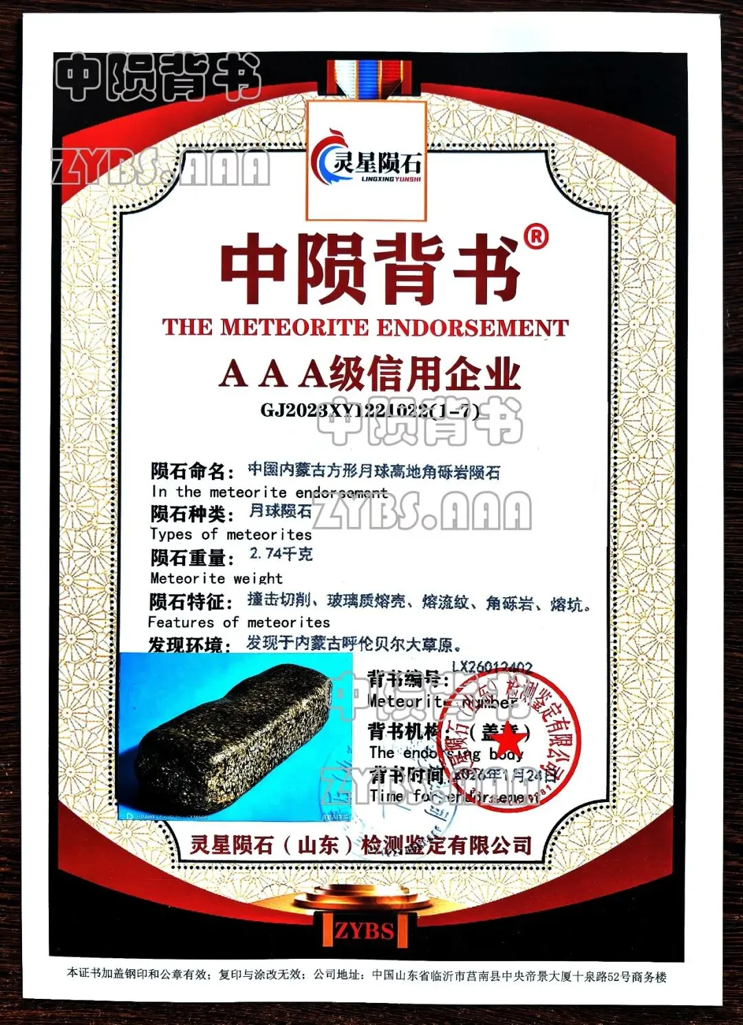 图十一:灵星陨石(山东)检测鉴定有限公司为该陨石予以命名:中国内蒙古方形月球高地角砾岩陨石。背书编号:LX26012402;