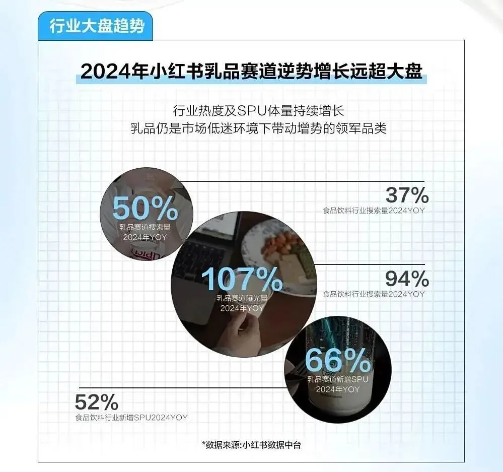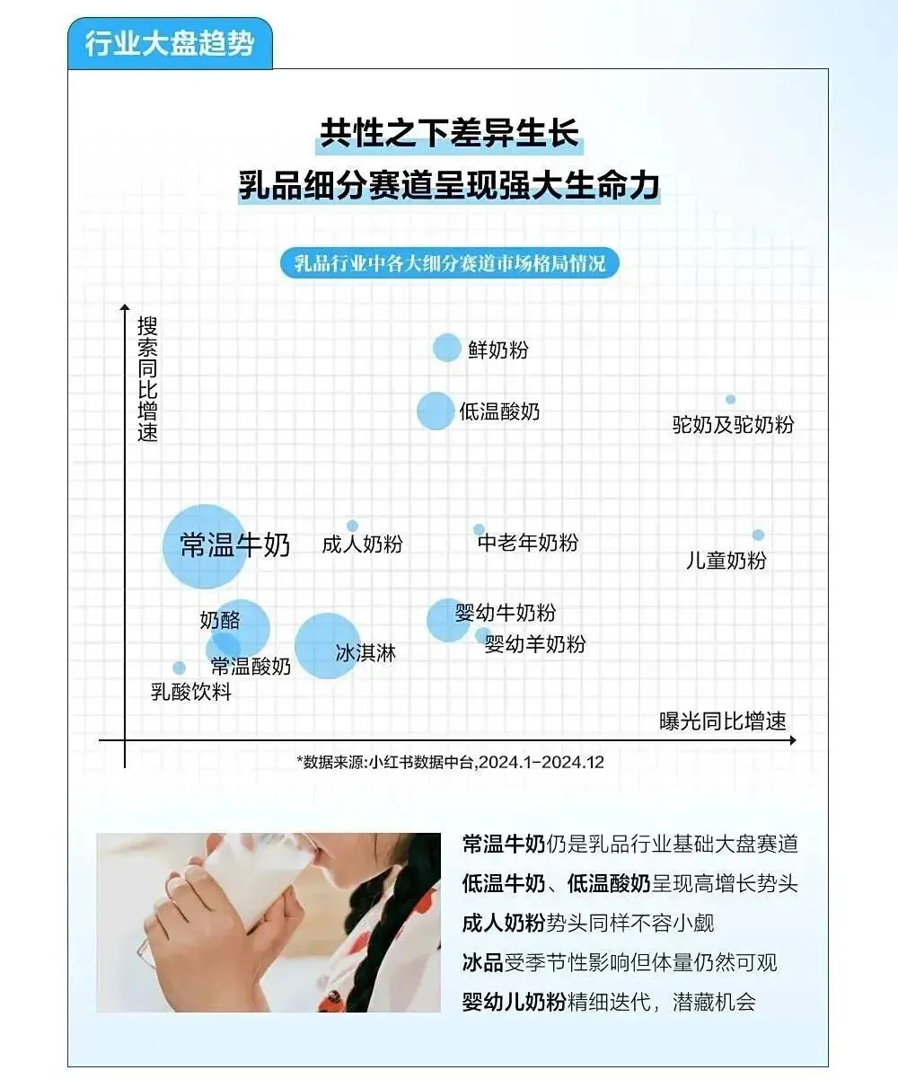 在小红书,随着常温牛奶、常温酸奶、低温鲜奶、低温酸奶、雪糕冰品、成人奶粉、儿童奶粉等七大细分赛道的蓬勃生长,部分赛道呈现出爆发增长之势:低温酸奶搜索增速达358%,成人奶粉增速超109%。